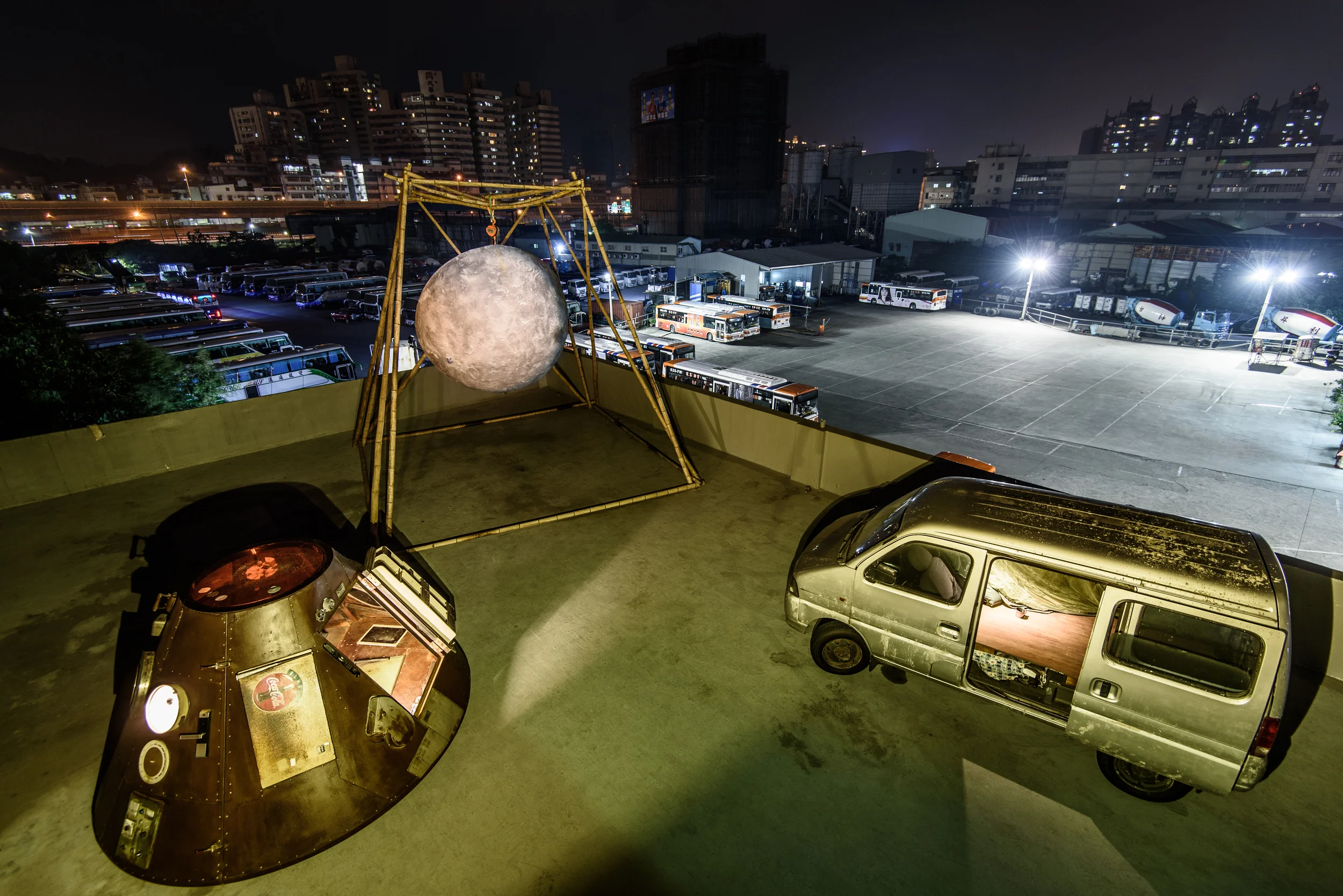 看完就被廢棄的傳說是個起點。<月球太空計畫> 試圖創造一個漫遊在太空與日常生活的裝置奇觀, 一個由現代生活的疏離狀態下拓展的幻想場景。