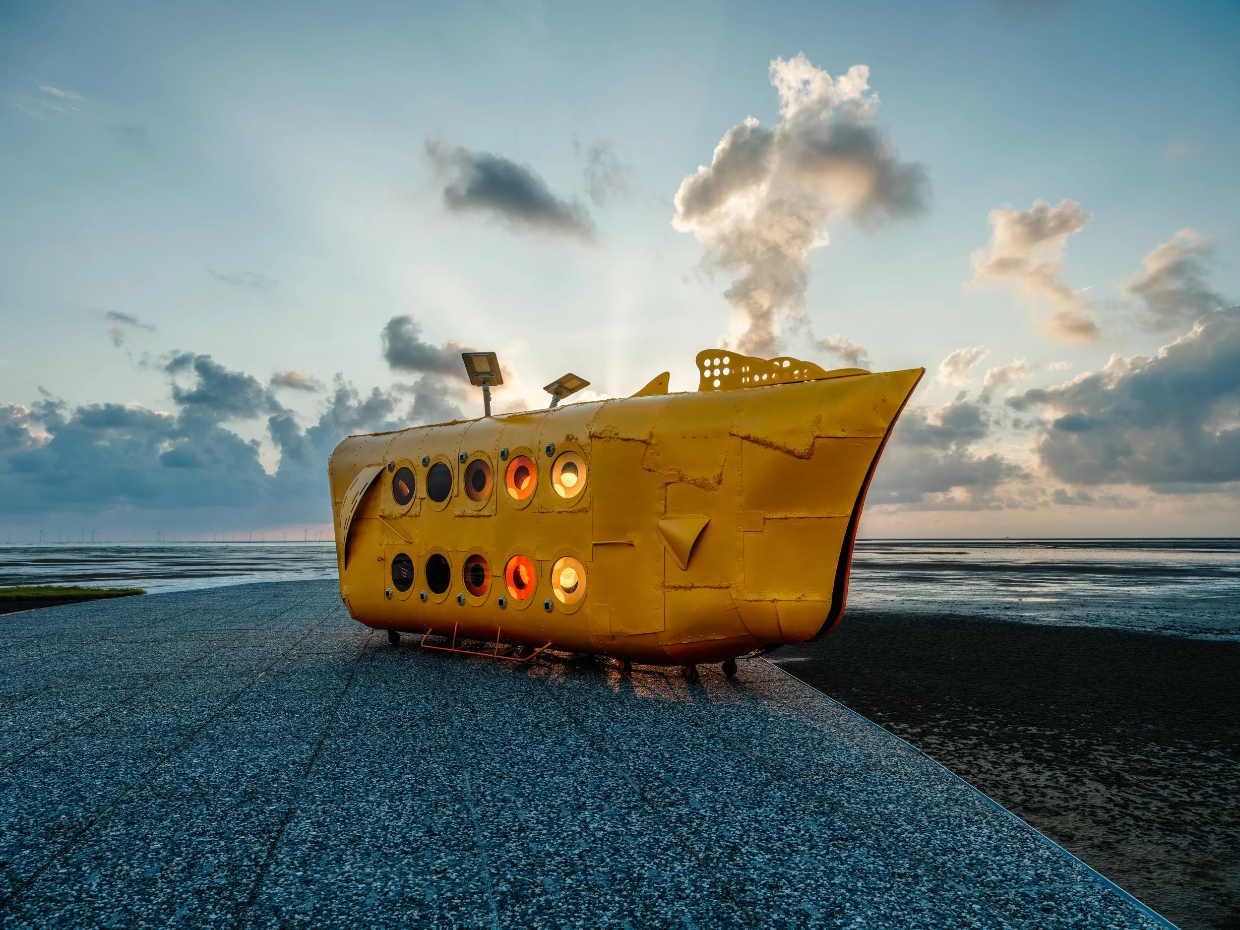 <旅行車>原有的箱型車已經報廢,重新製作,以初始的概念(高速交通工具結合休憩空間的木地板和加熱中的咖啡,表達在習以為常的高速生活中,怡然自得的擁有咖啡時光、休息時間,生活好像在不停變速的空間)變型,演變為不同的型態,汽車前方接近轉彎處的反光廣角鏡,汽車停在高速之後的翻車狀態,內部的木地板分割拼接成轉彎方向的警示標誌,指向相反的行進方向,木板上懸置一杯翻倒的玻璃杯和停止的水,汽車平衡在高速之後靜止的情境物件拼貼中,連結時空不停變異的現實世界。